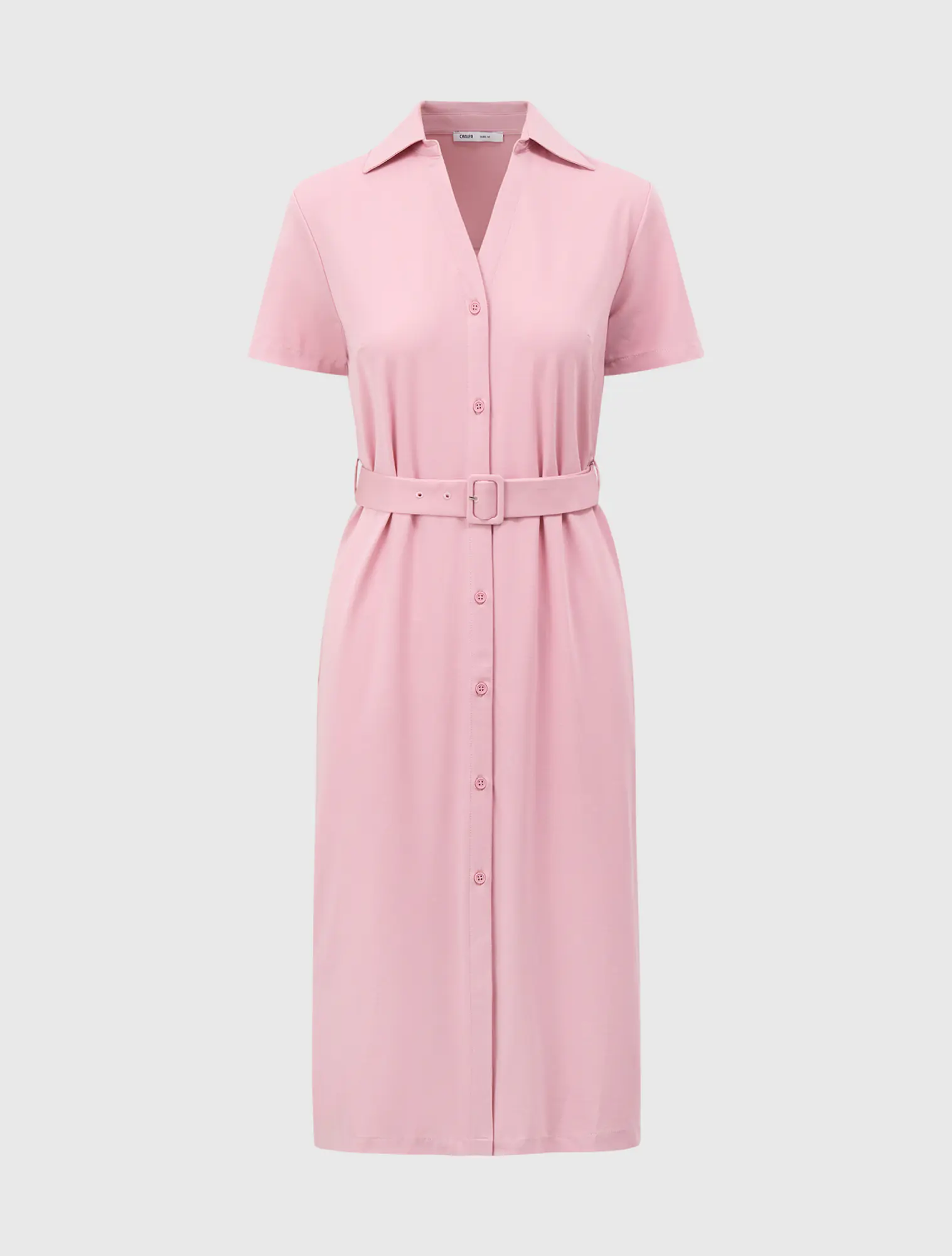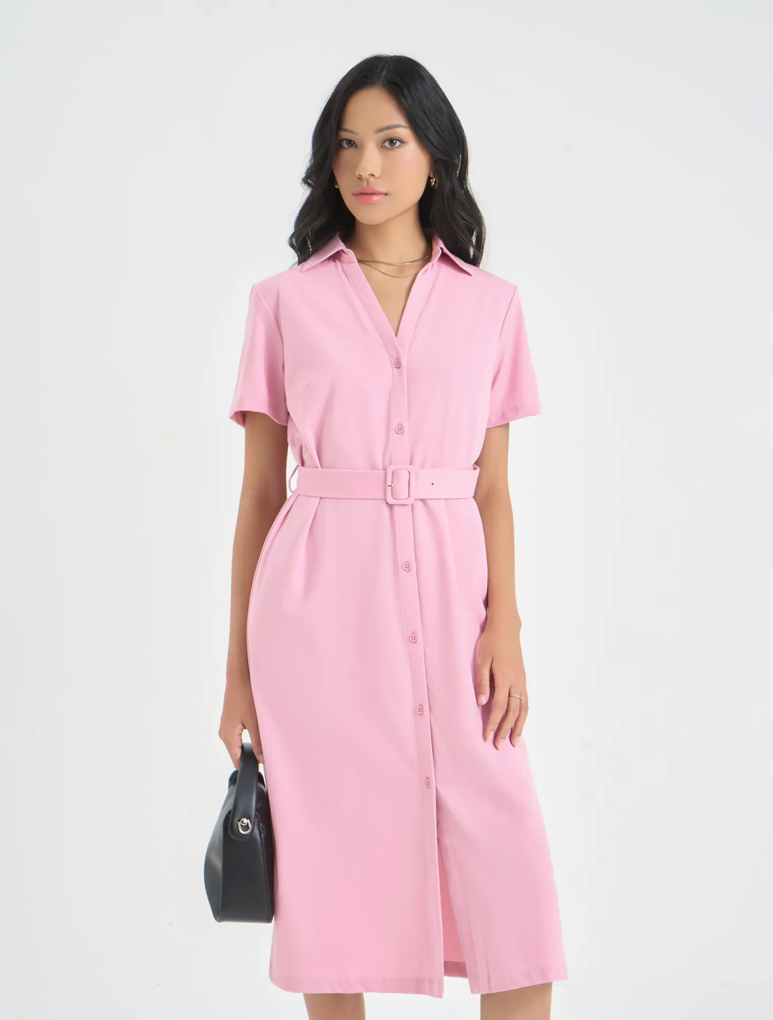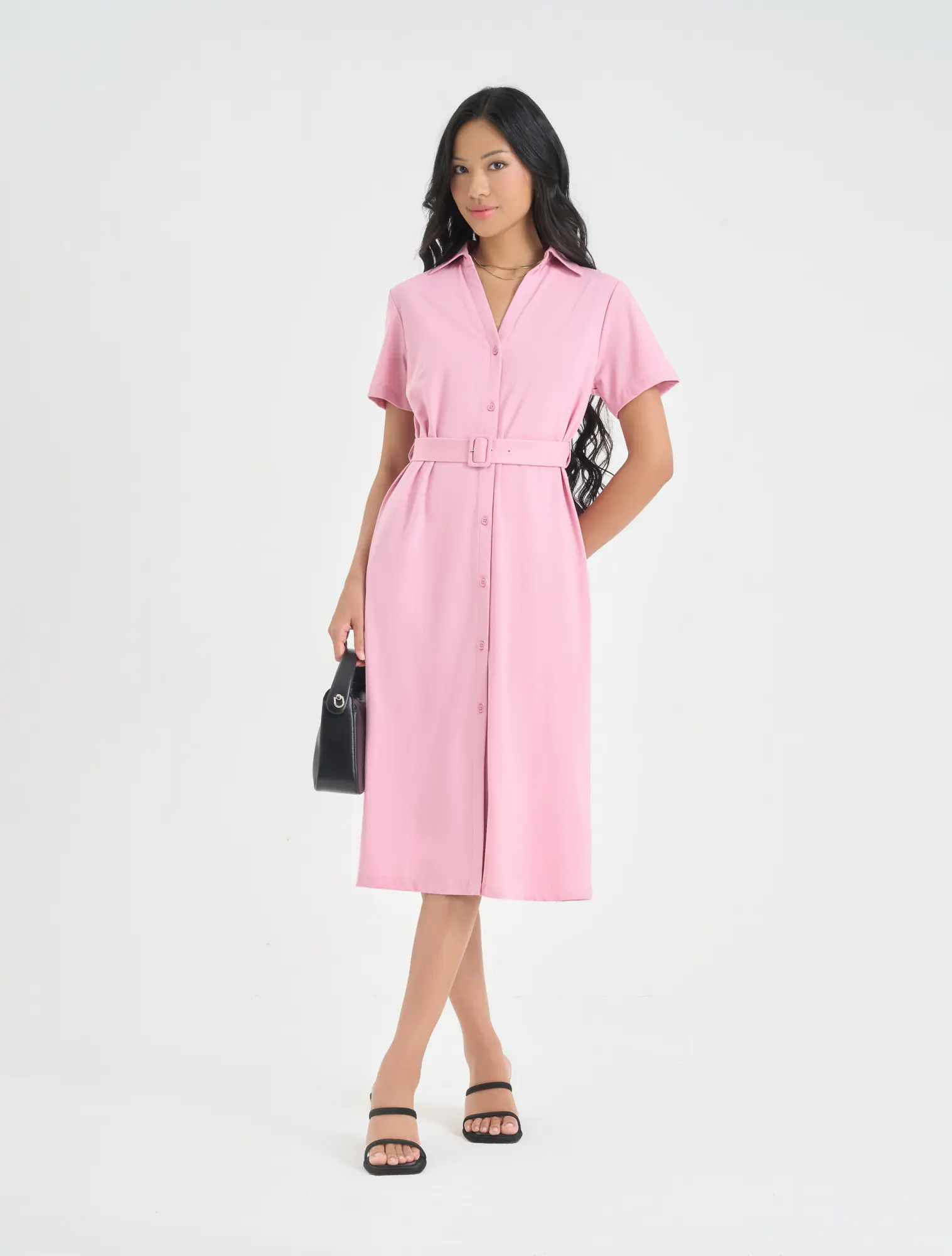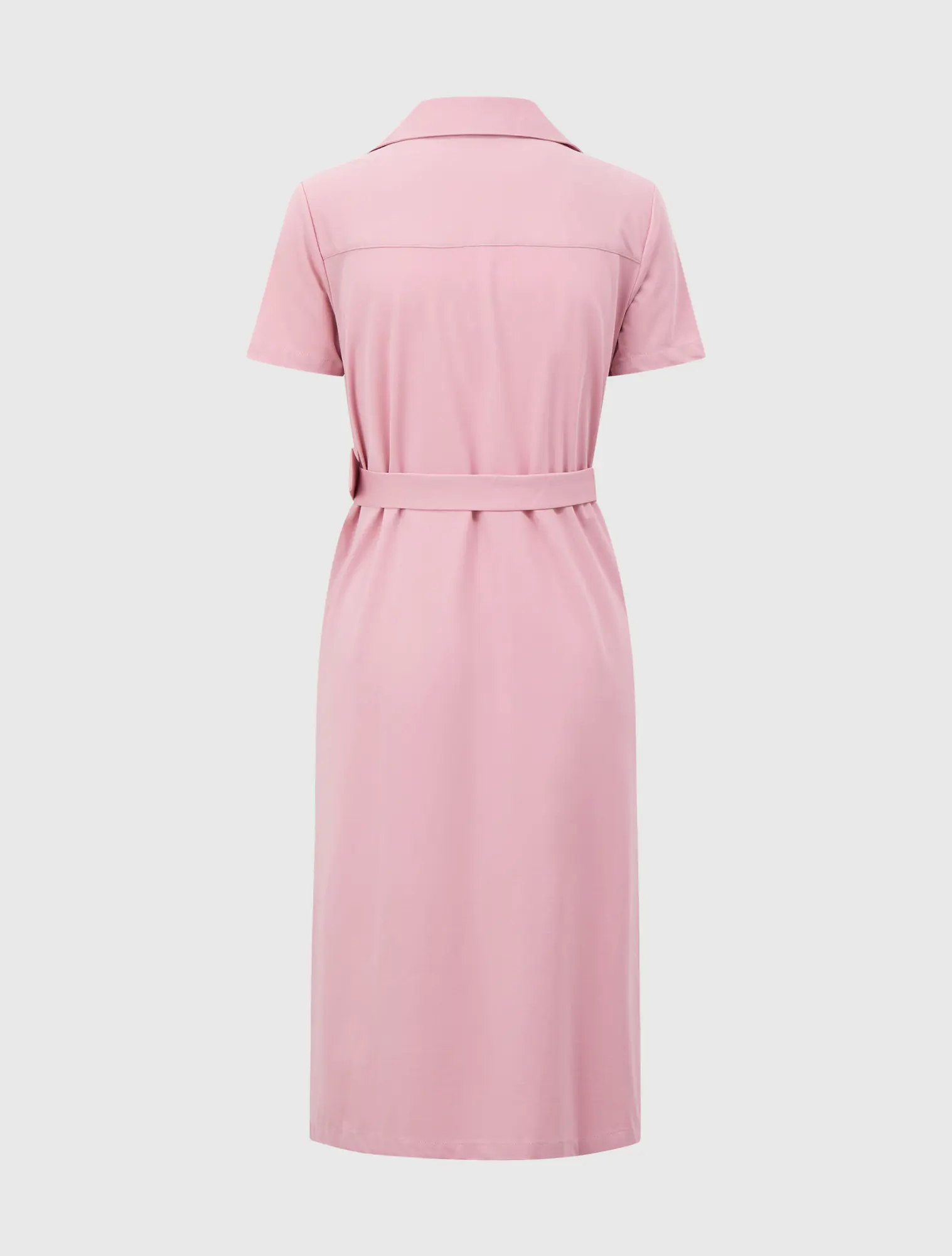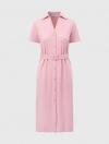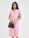 Váy liền dài cổ đức, ngắn tay. Kiểu dáng rộng vừa, có dây thắt eo tôn dáng.