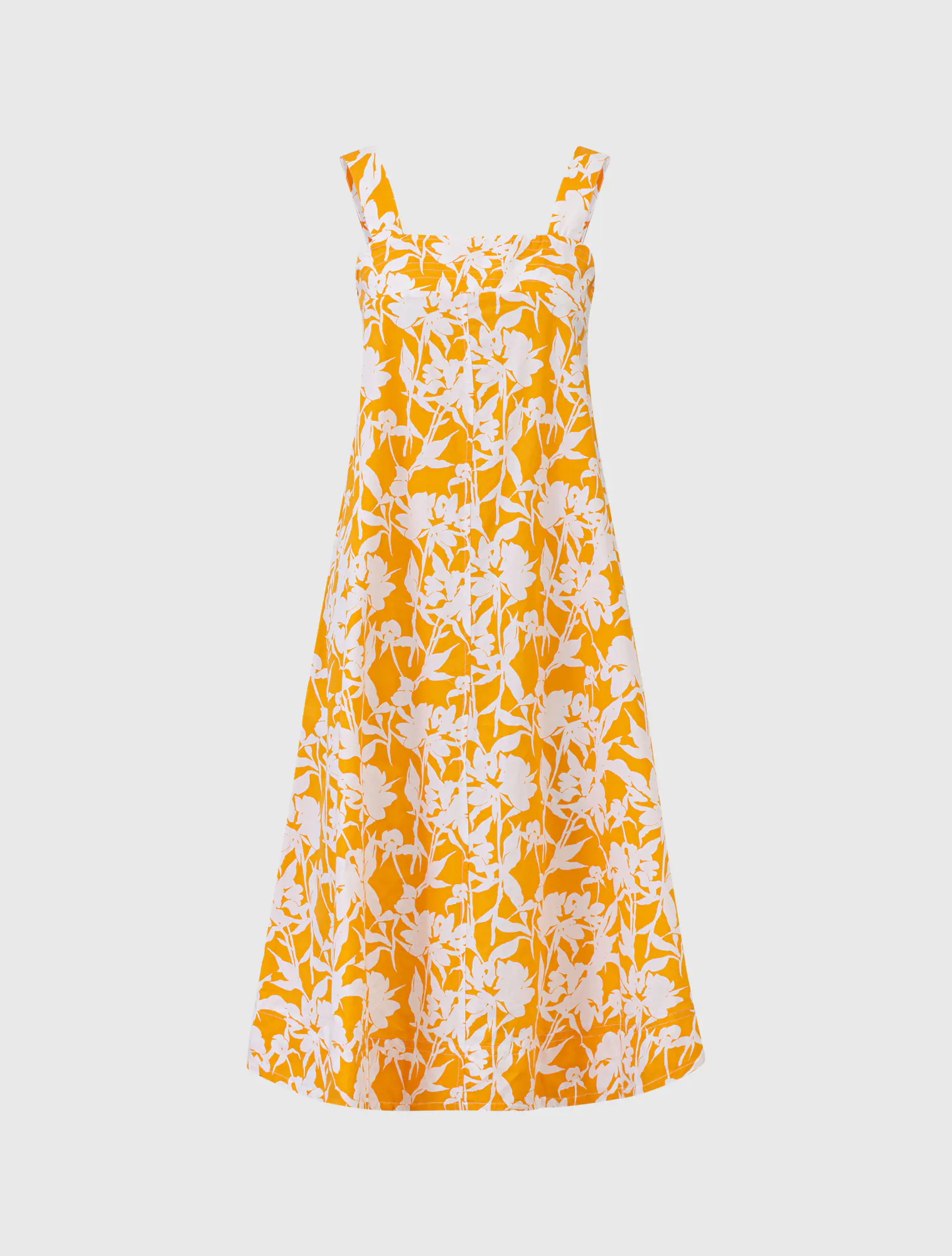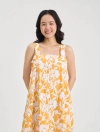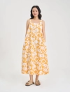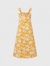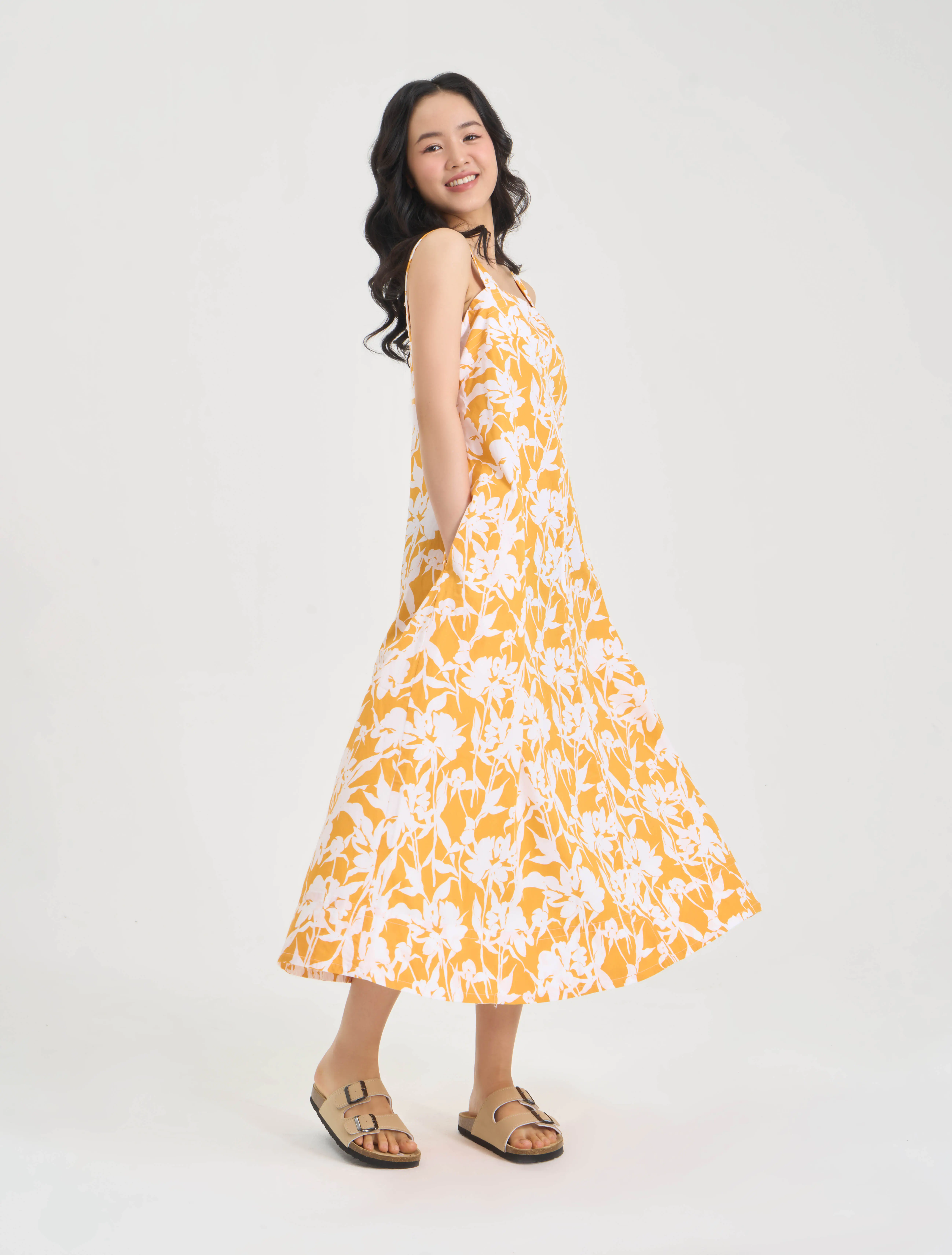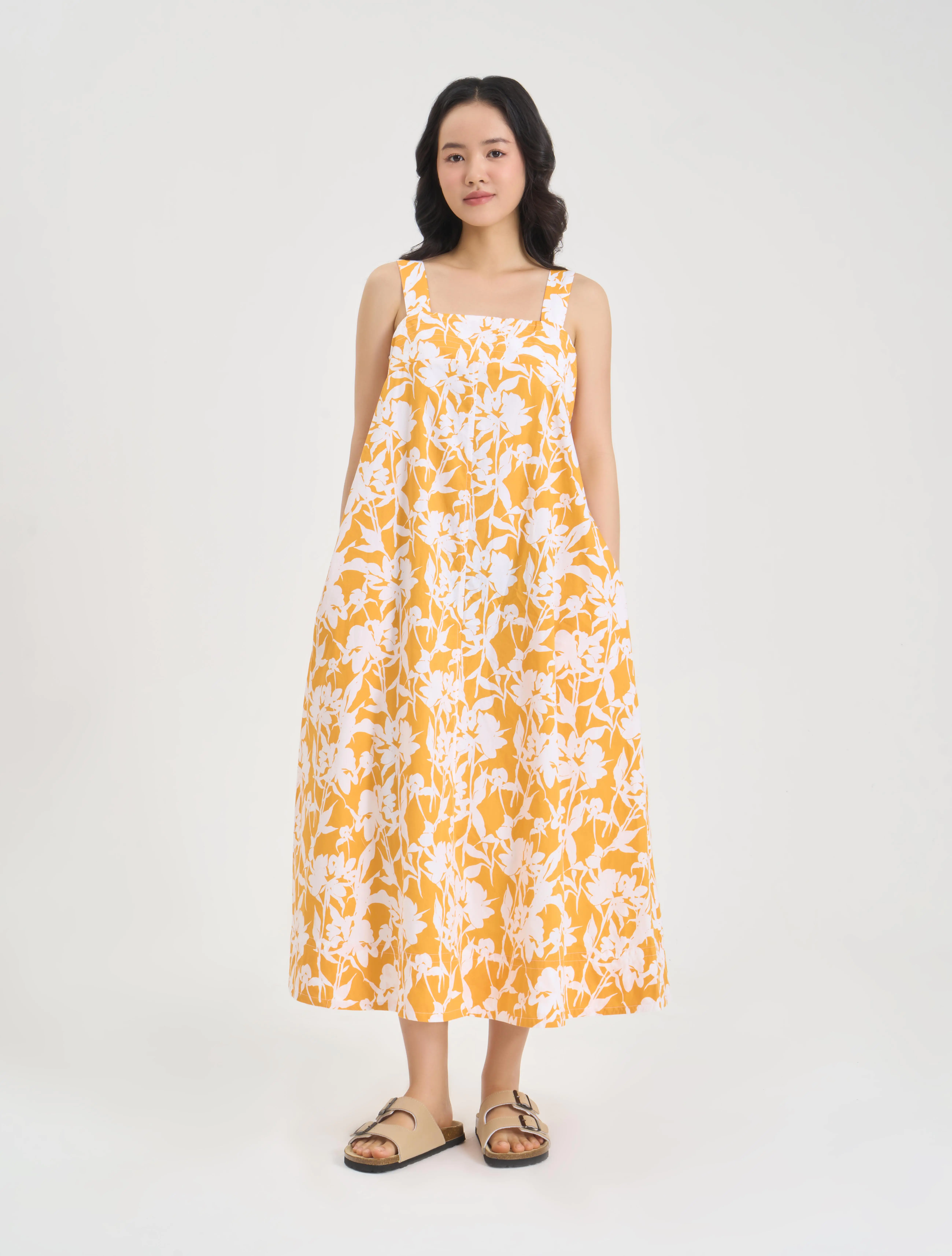 Đầm nữ hai dây dáng midi, phom rộng vừa, chất liệu cotton thoáng mát, họa tiết in tươi mới phù hợp với mùa hè, đi chơi, dạo phố, du lịch.