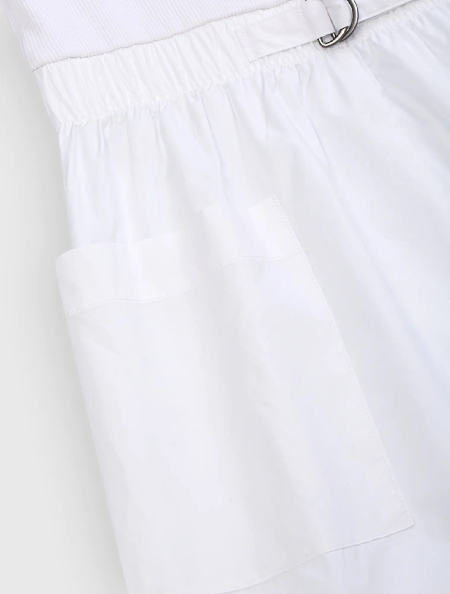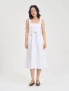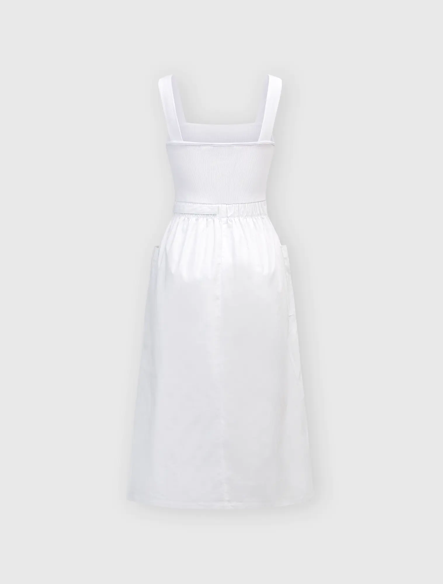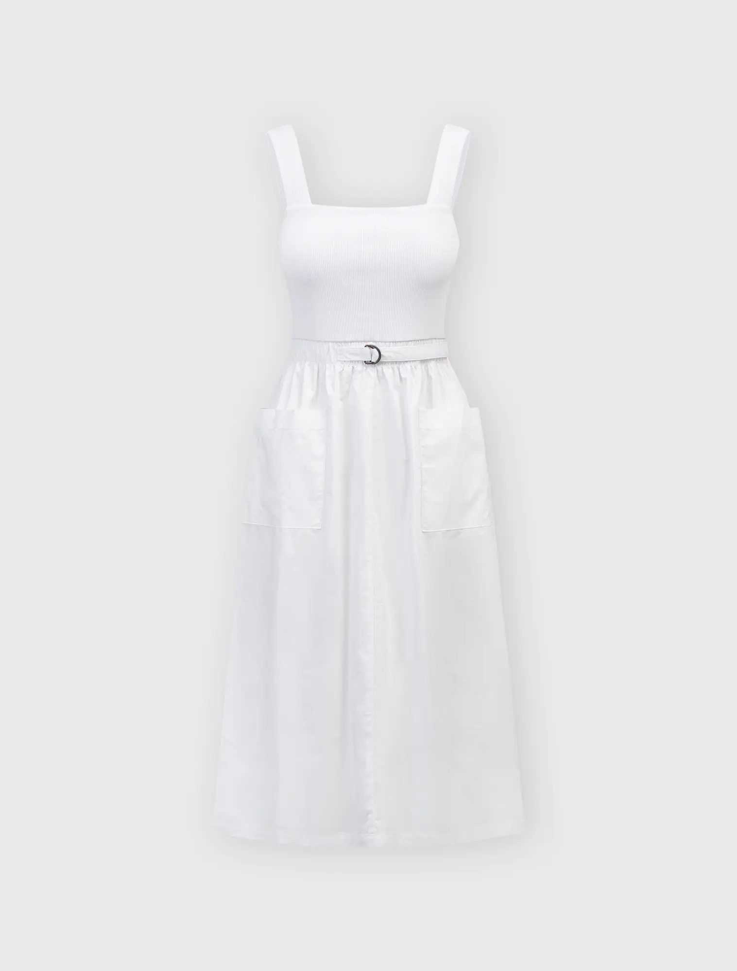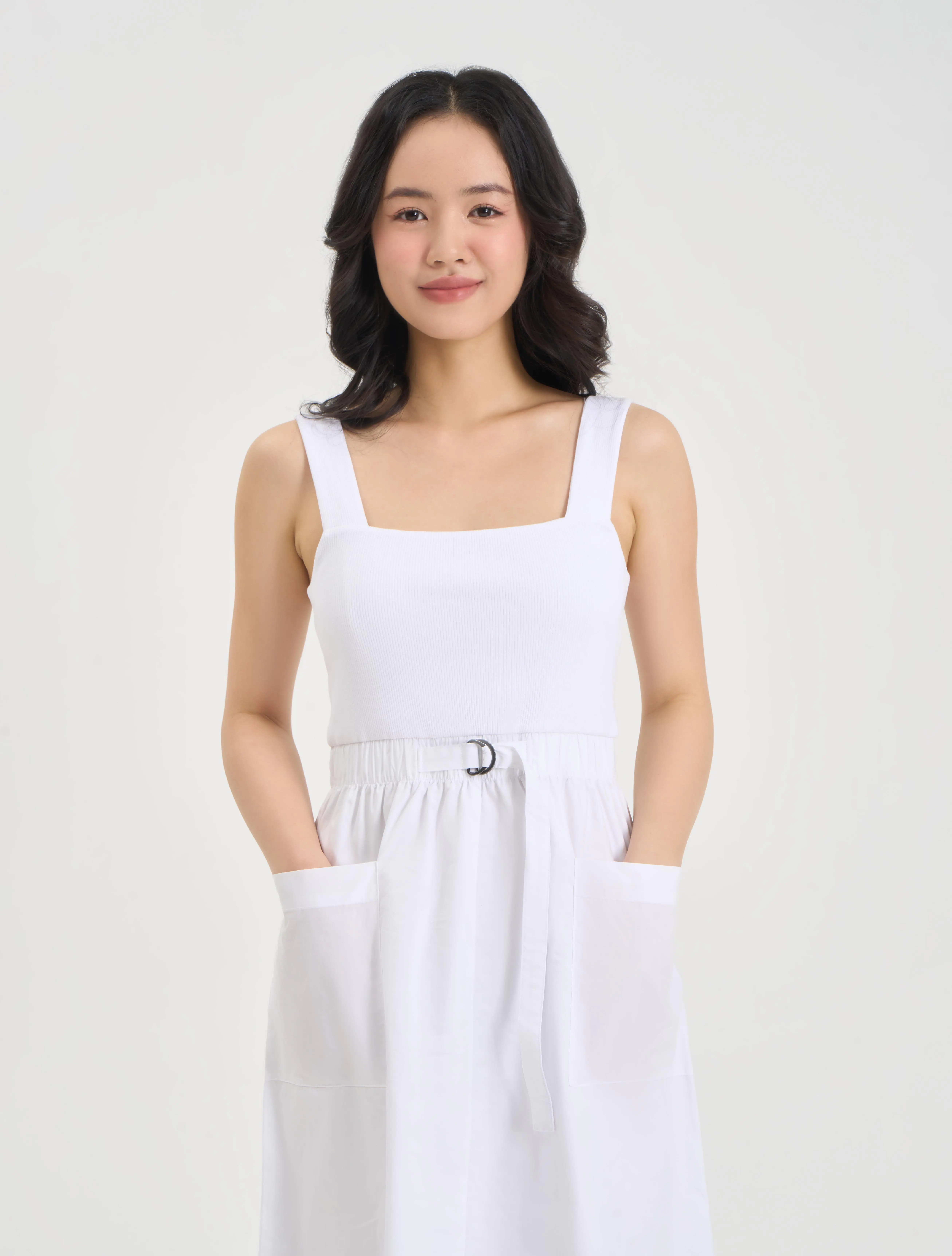 Váy liền 2 dây bản to, phối chất liệu, dáng midi tôn dáng. Váy có dây đai trang trí đi kèm.