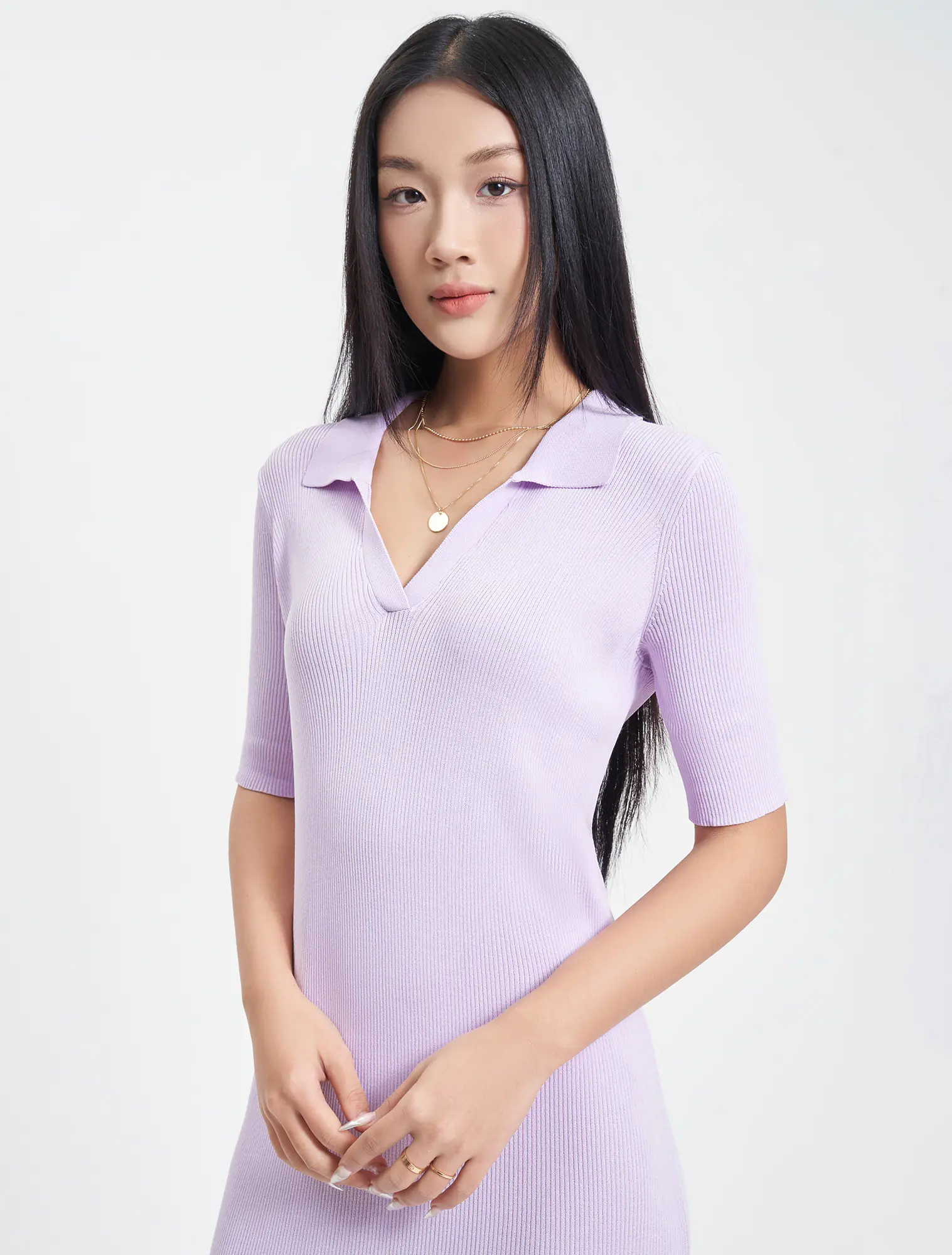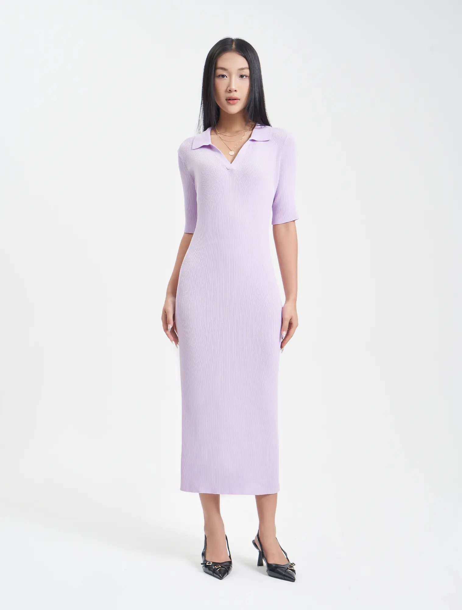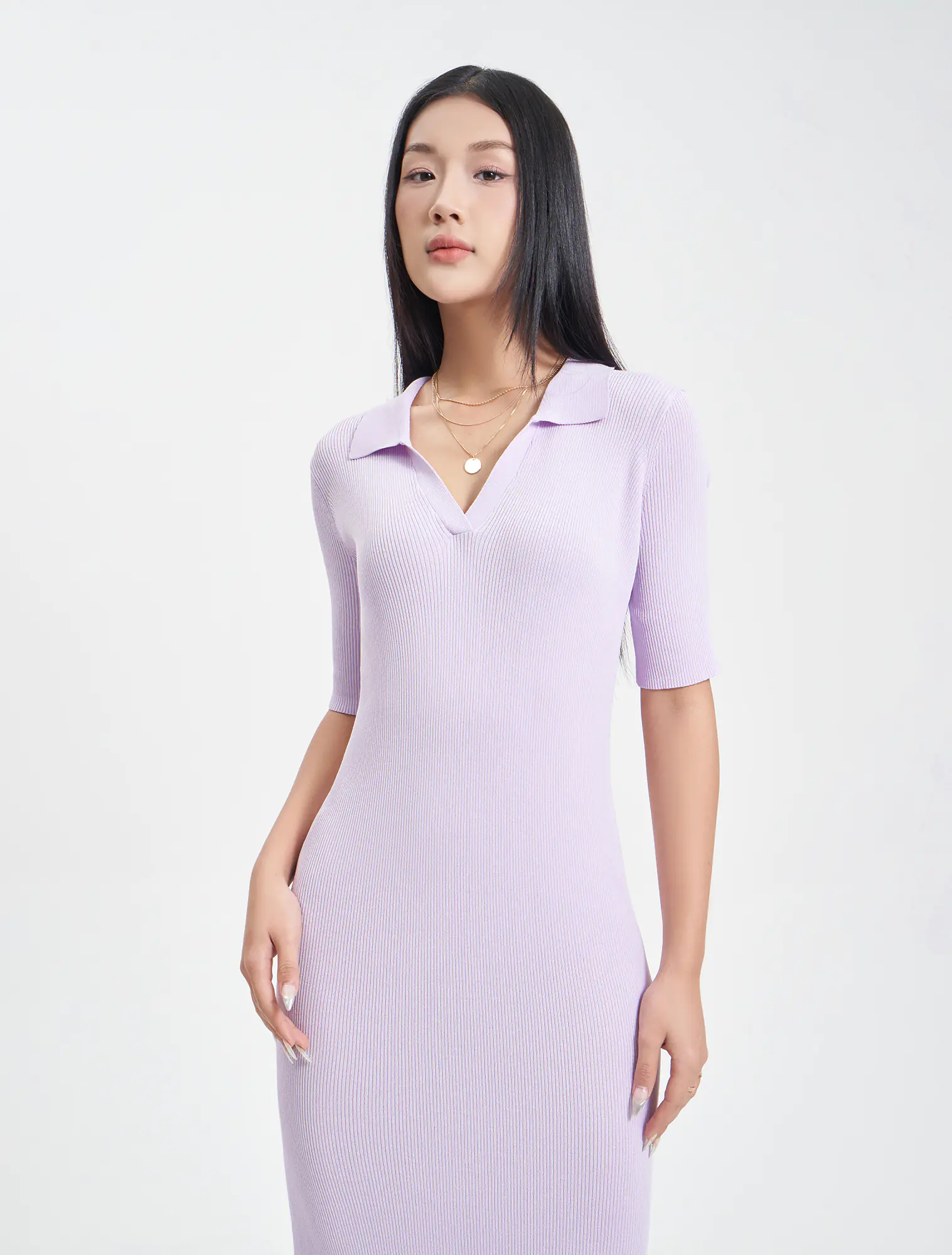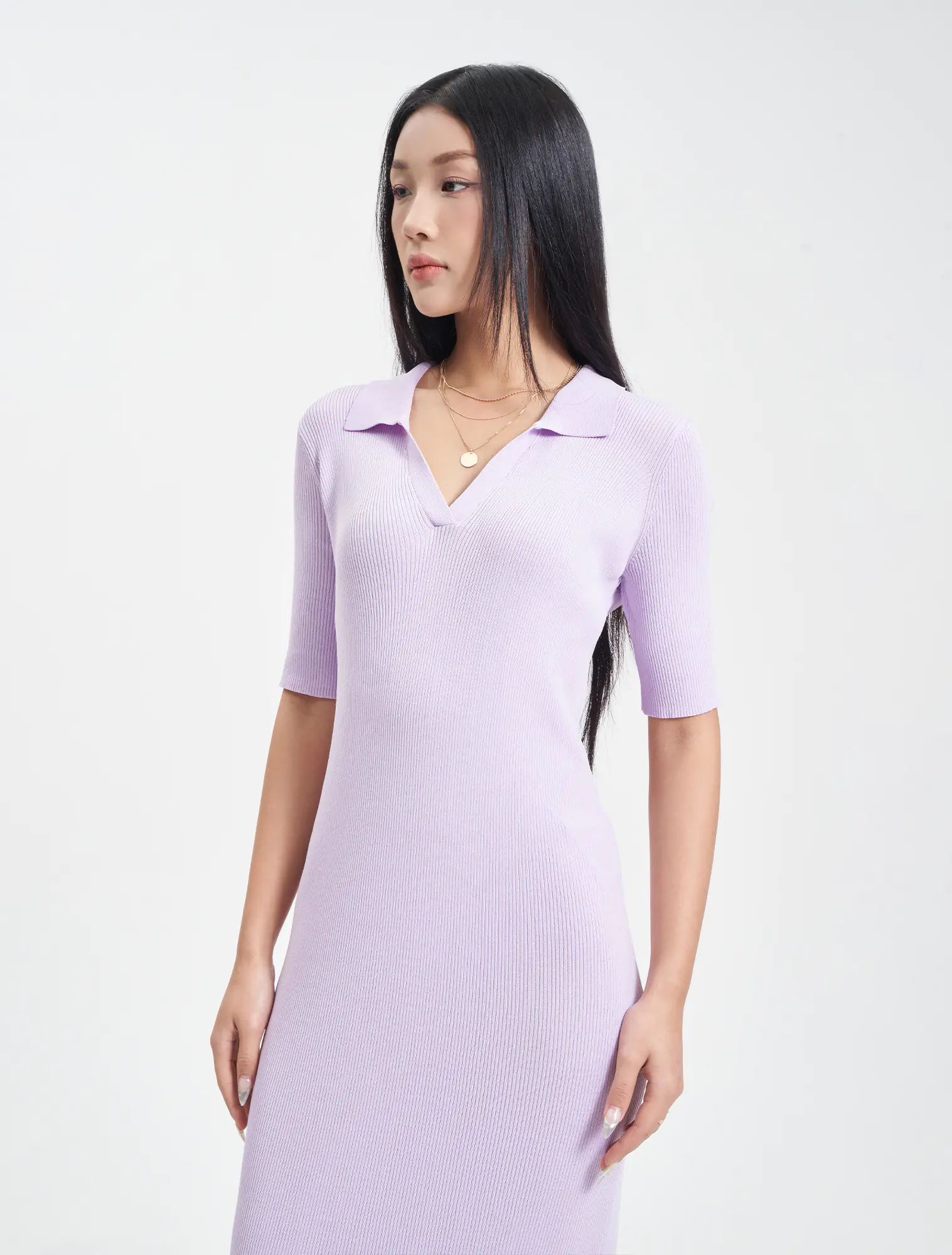Váy len nữ cộc tay cổ polo, dáng áo rộng vừa, chất liệu và kiểu dáng phù hợp với thời tiết giao mùa, hoàn cảnh sử dụng linh hoạt.
