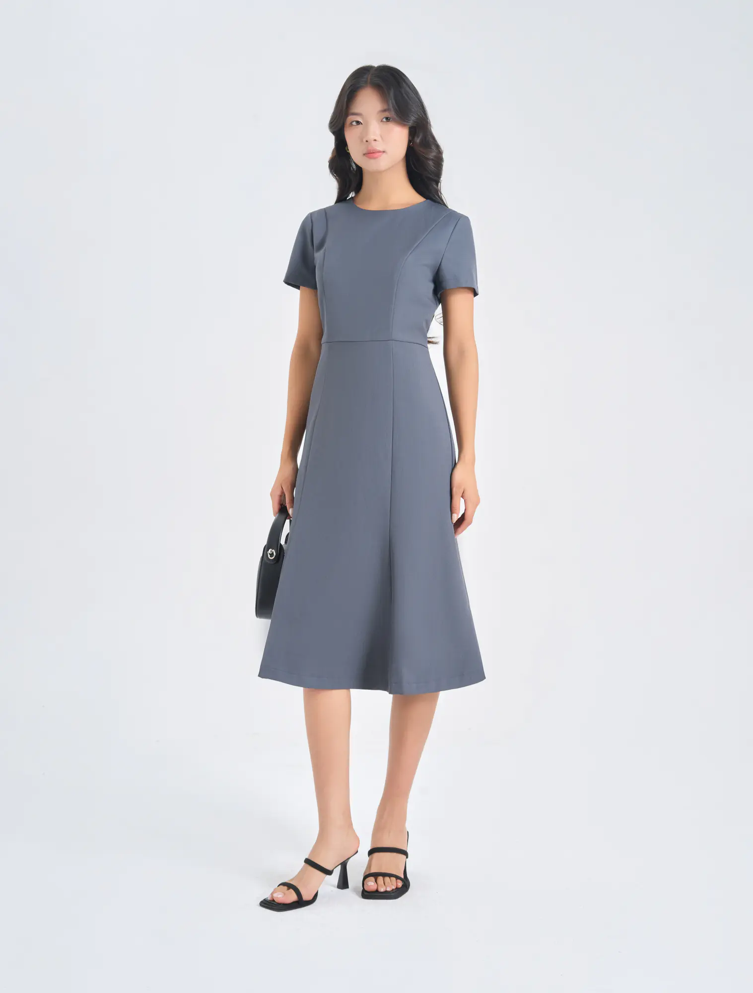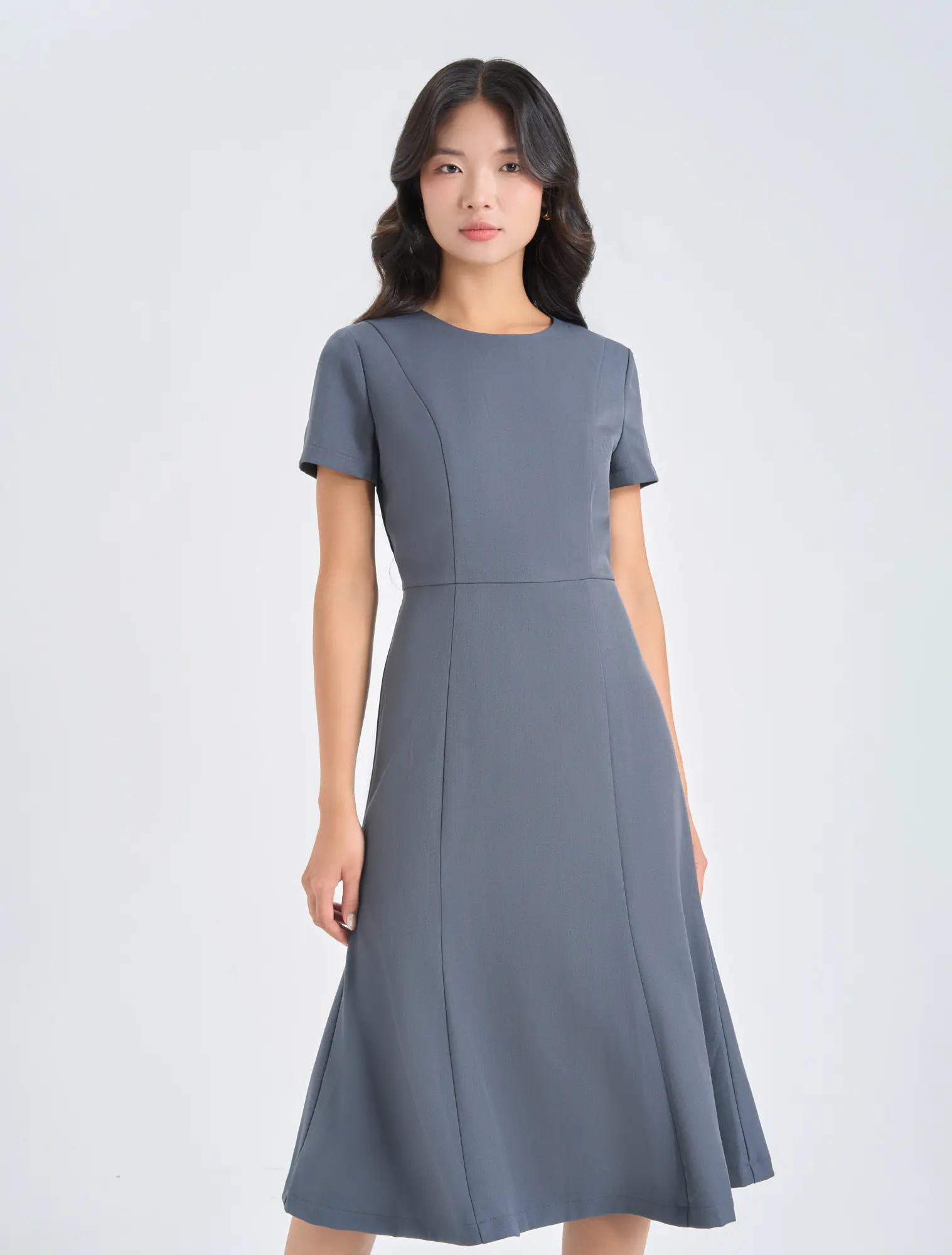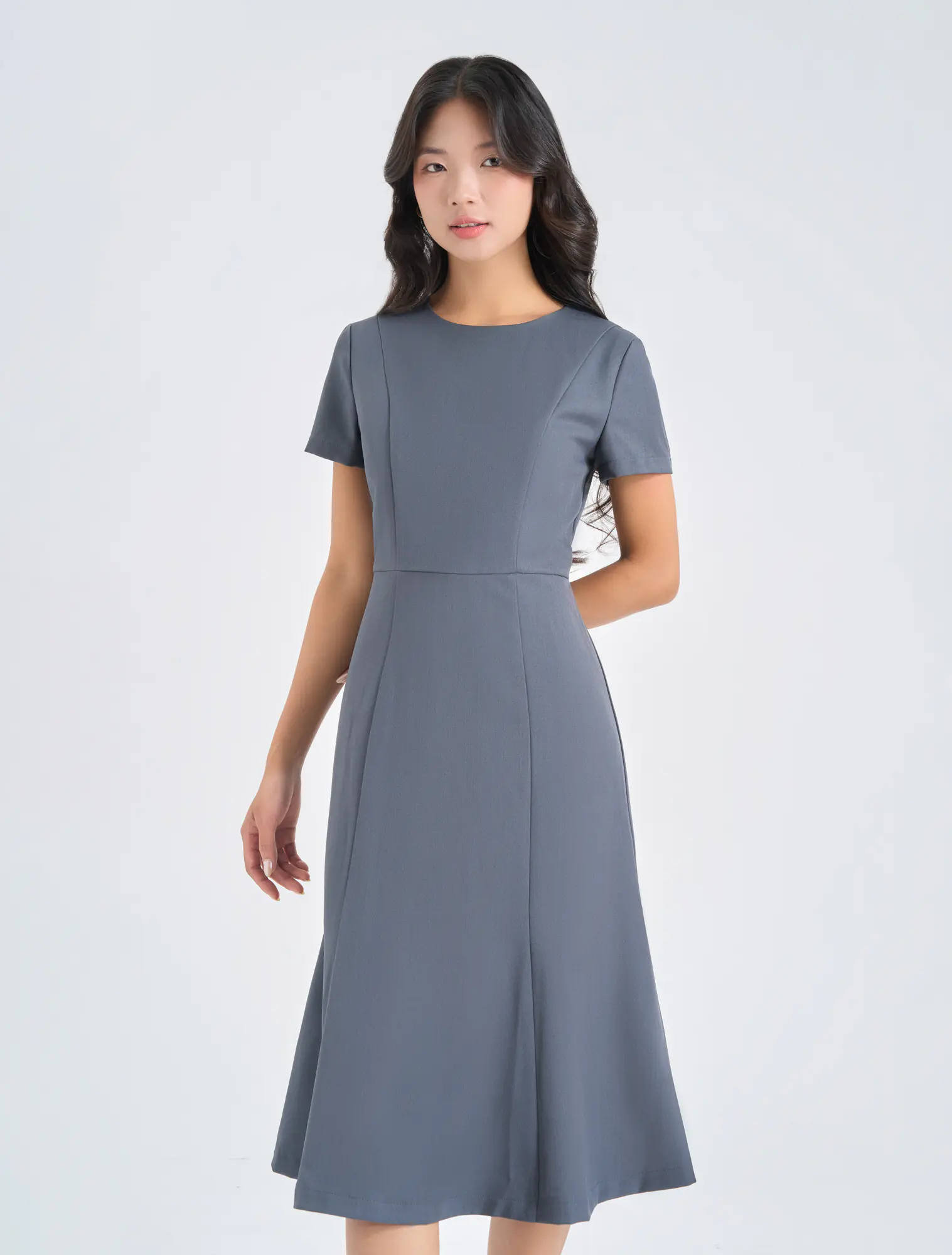 Váy liền nữ dáng ôm A, tay ngắn, cổ tròn, chất liệu polyester spandex dầy dặn, co dãn nhẹ, phù hợp môi trường công sở.