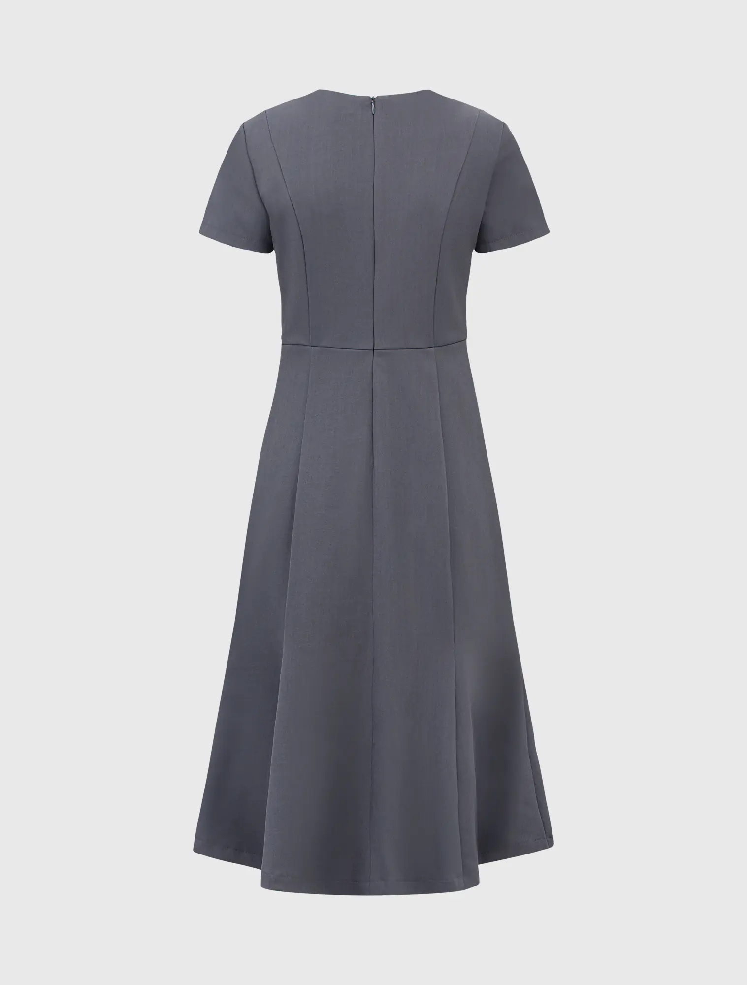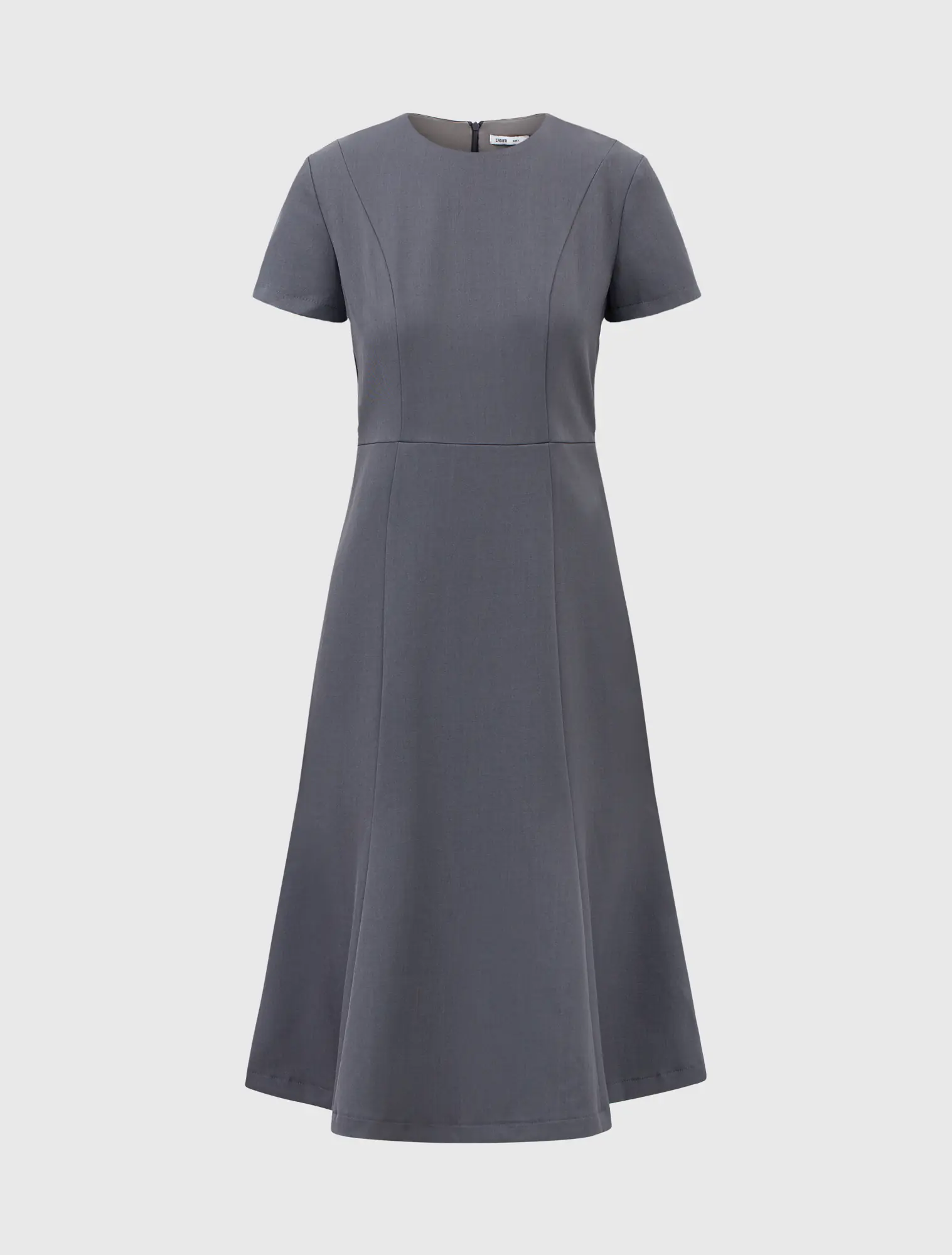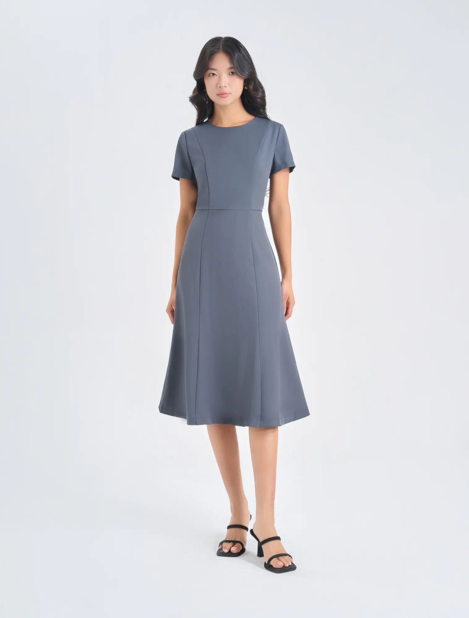 Váy liền nữ dáng ôm A, tay ngắn, cổ tròn, chất liệu polyester spandex dầy dặn, co dãn nhẹ, phù hợp môi trường công sở.