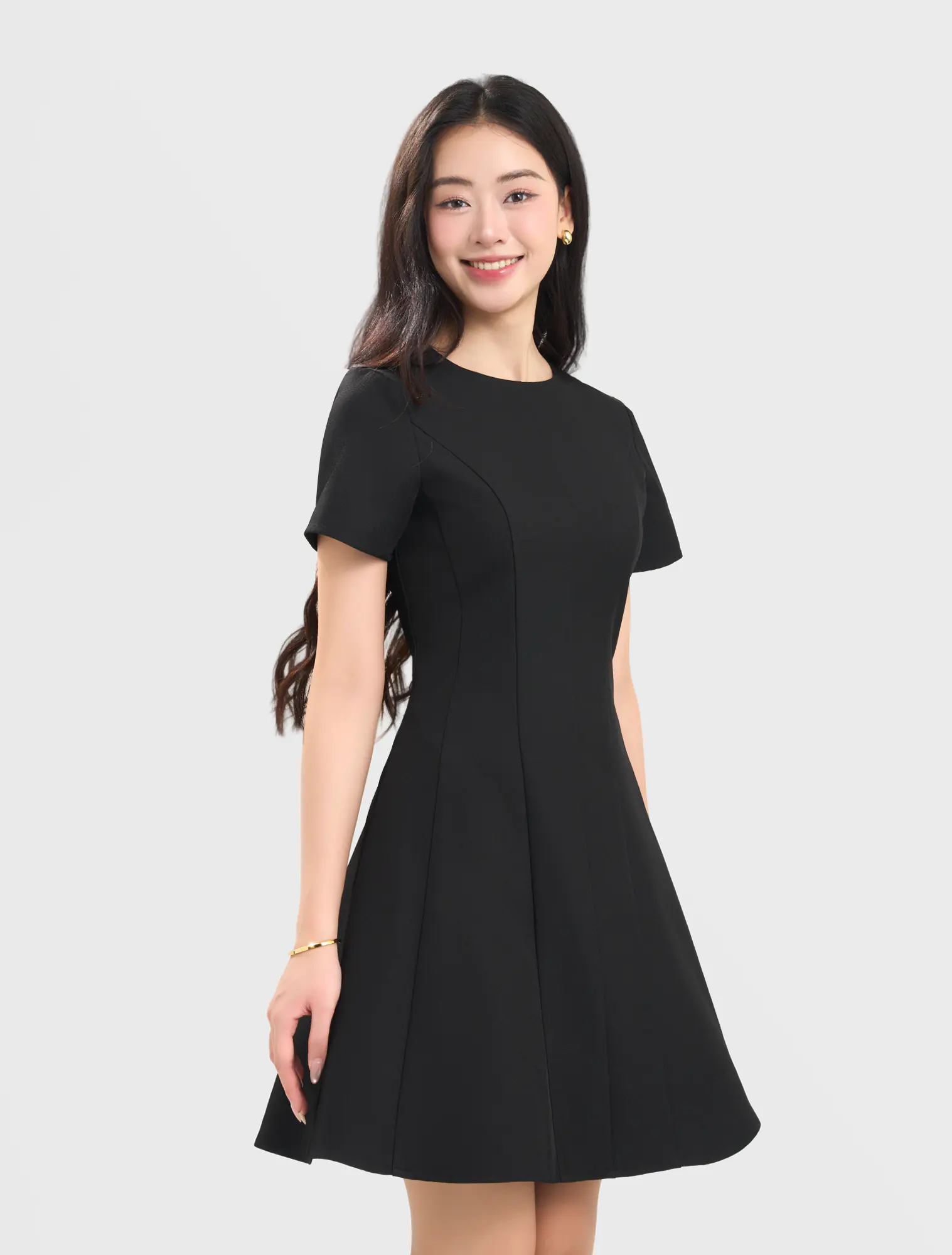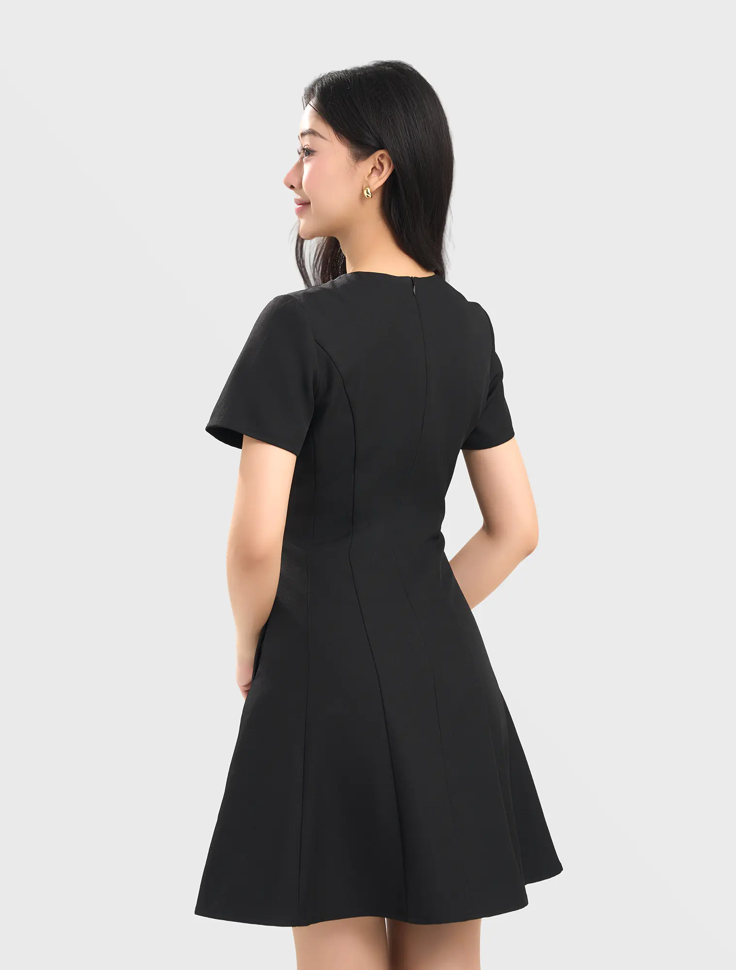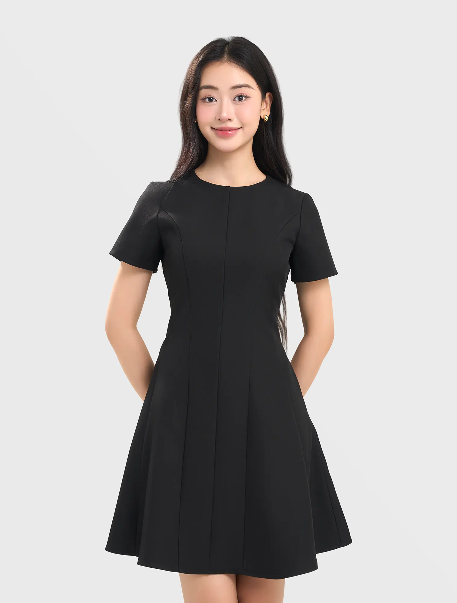 Váy liền nữ dáng A, kéo khóa hai lớp. Chất liệu poly pha mềm mại, đứng phom, phù hợp môi trường văn phòng, công sở.