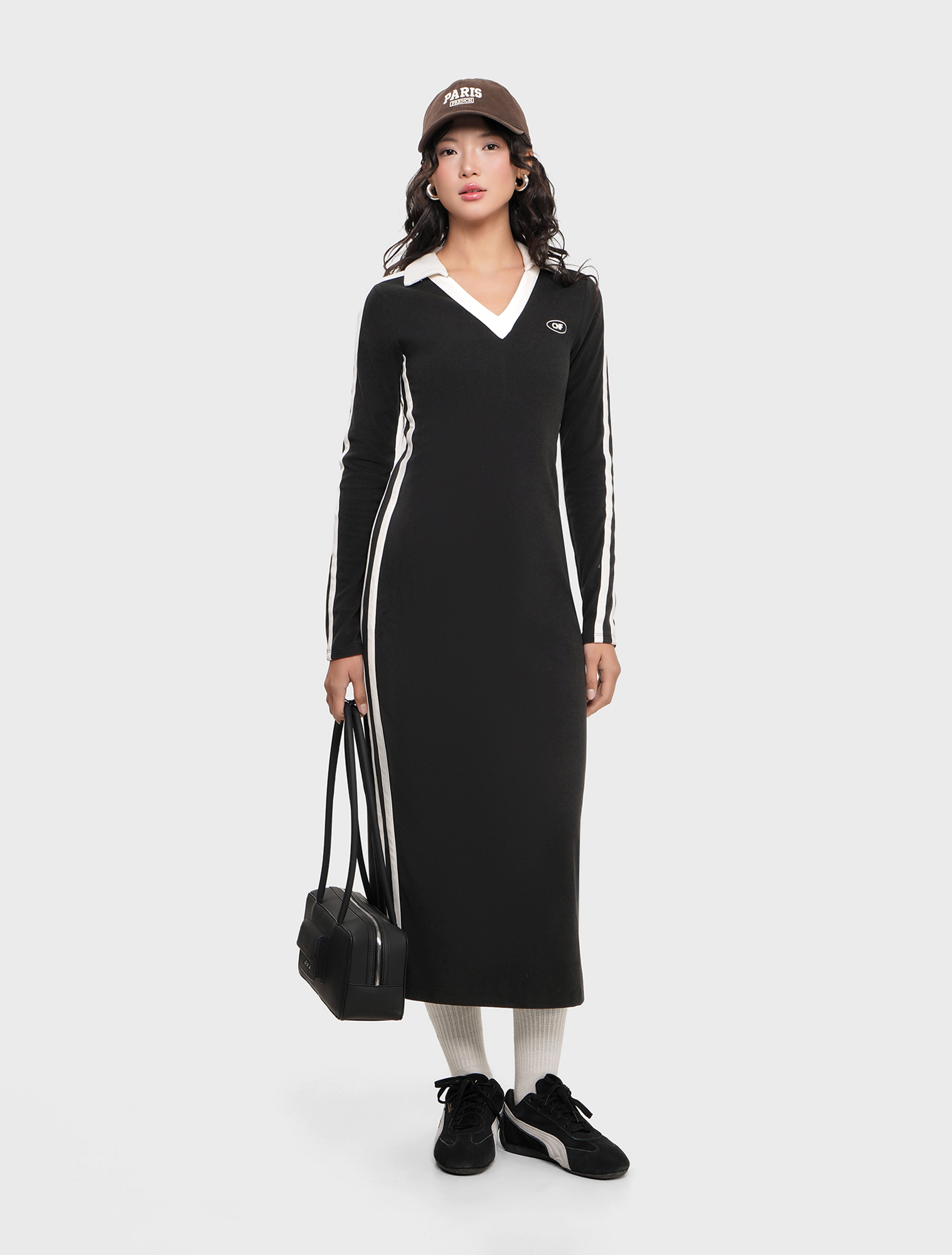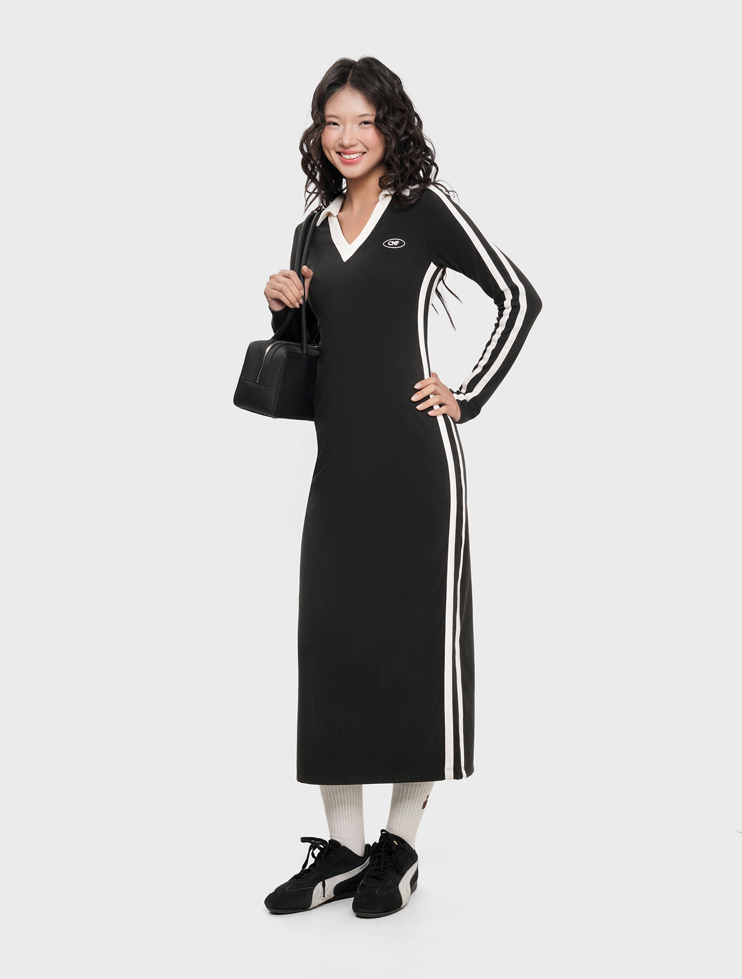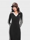 Váy liền nữ dáng ôm dài kiểu dáng thể thao với chi tiết phối màu dọc 2 bên sườn váy và cổ áo,